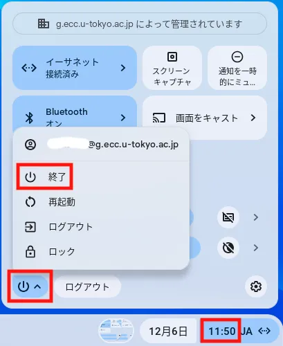 画面右下の時刻部分を選択すると表示される電源ボタンを選択すると,メニューボックスが開きます.その中の「終了」を選択してください.