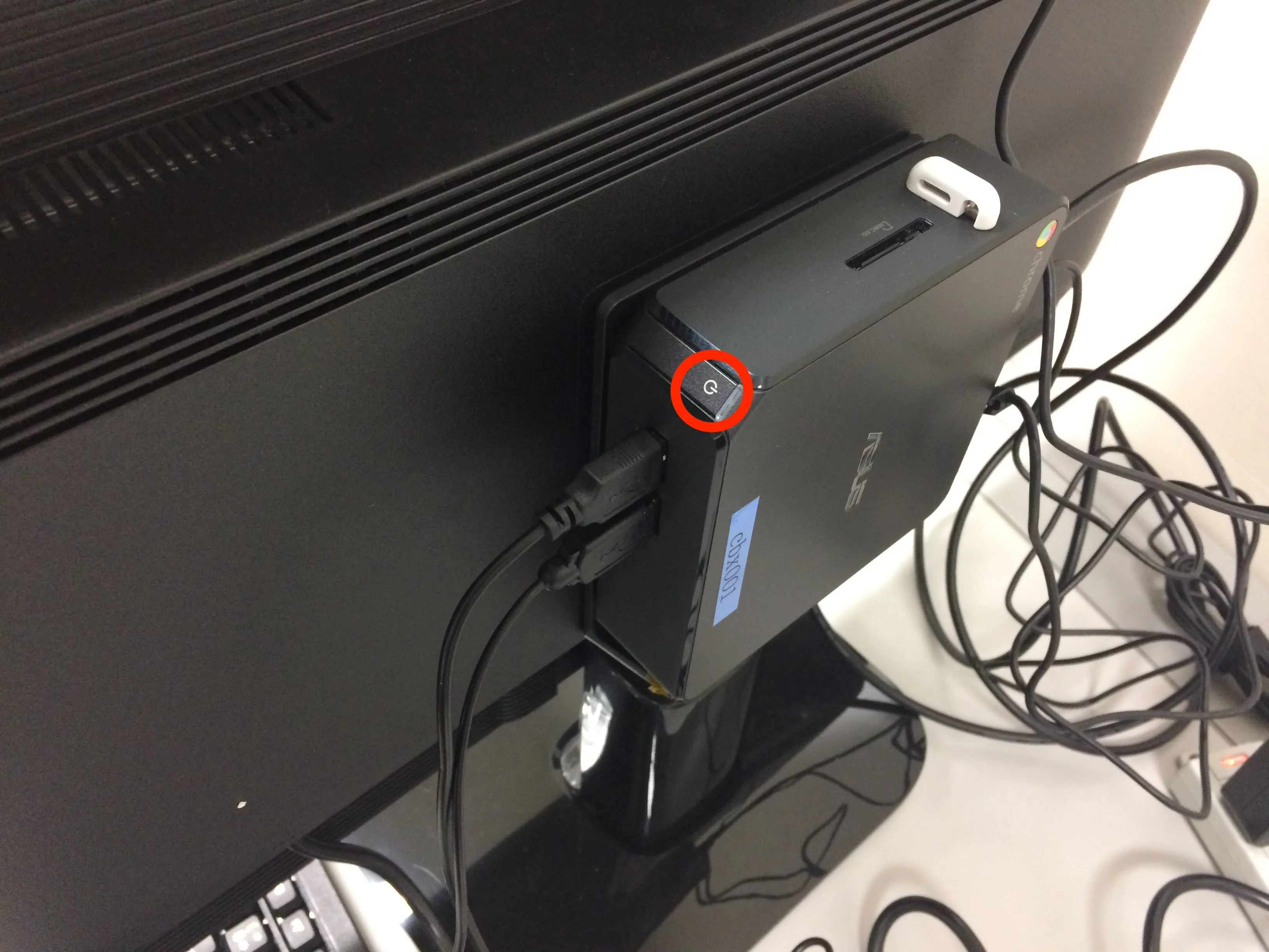 Chromebox端末の利用に当たっては,27インチディスプレイとChromebox本体の両方の電源を入れる必要があります.Chromebox本体は27インチディスプレイの裏にマウントされています.