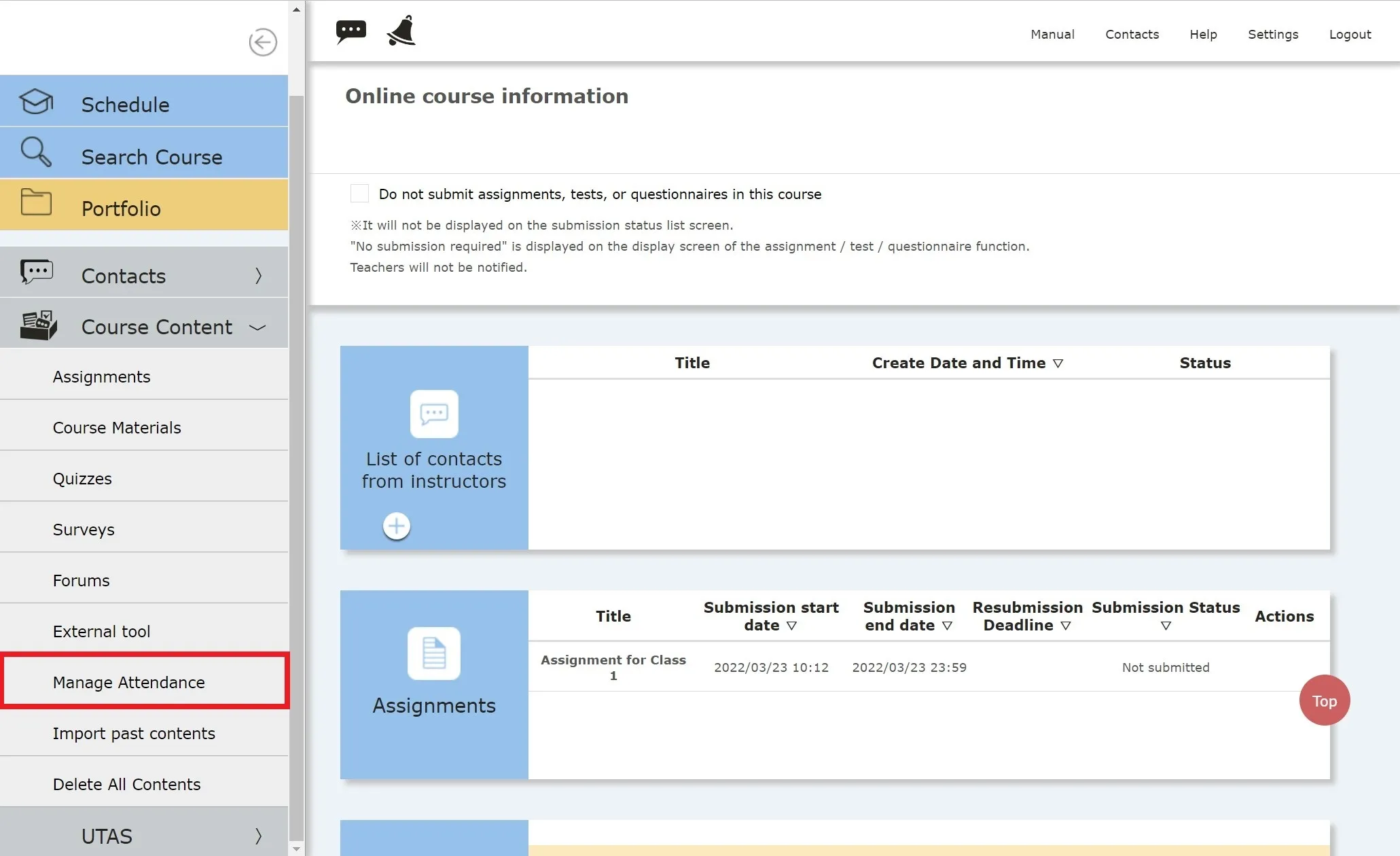 The ITC-LMS has an attendance management function, which can be used to take attendance during classes. Attendance management can be edited from the Course Content tab on the editing screen for faculty members on ITC-LMS. Please refer to this page for detailed information on how to manage attendance.