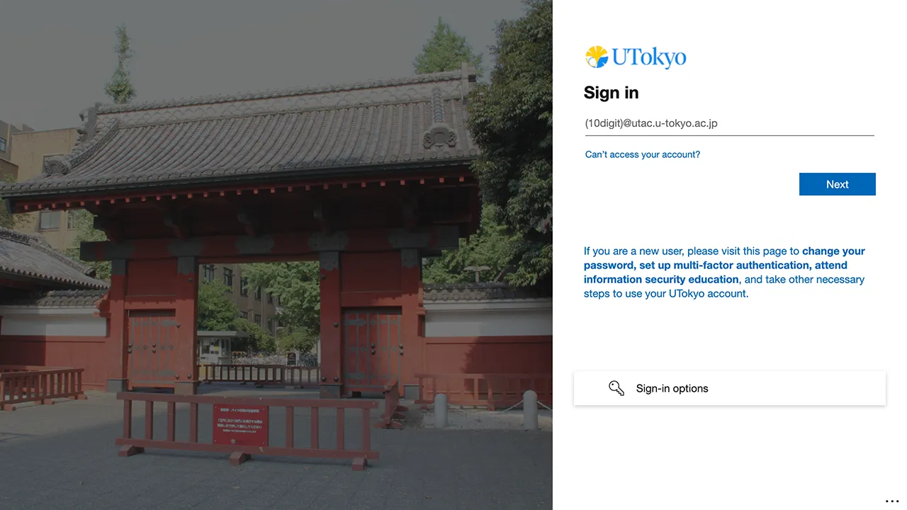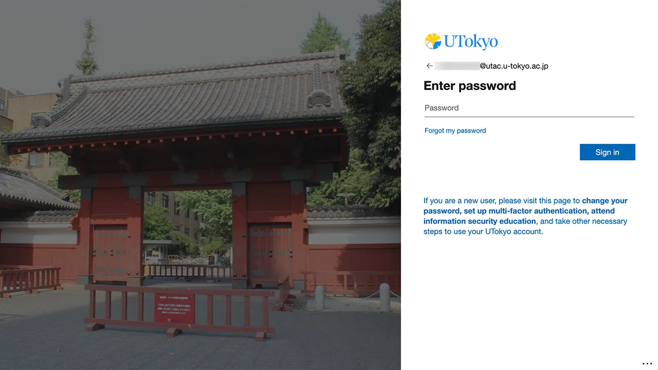 UTokyo Account has adopted the use of Multi-Factor Authentication (MFA). If you set up Multi-Factor Authentication, you will be asked to confirm your identity via SMS or an authentication application in addition to your password, when signing in to your account. For more information, please refer to the Using Multi-Factor Authentication for UTokyo Accounts page.