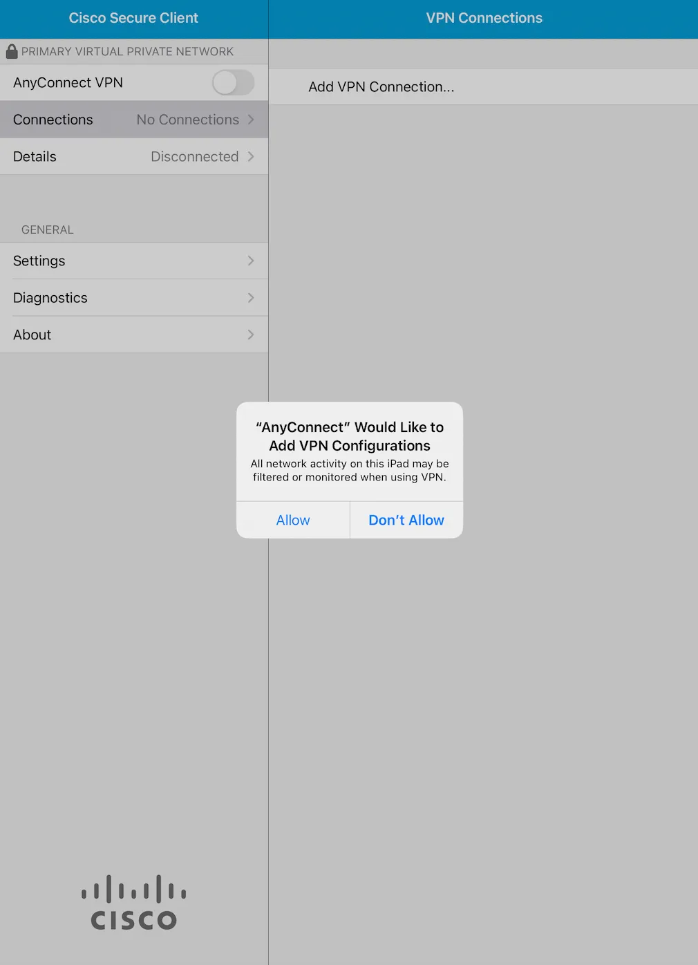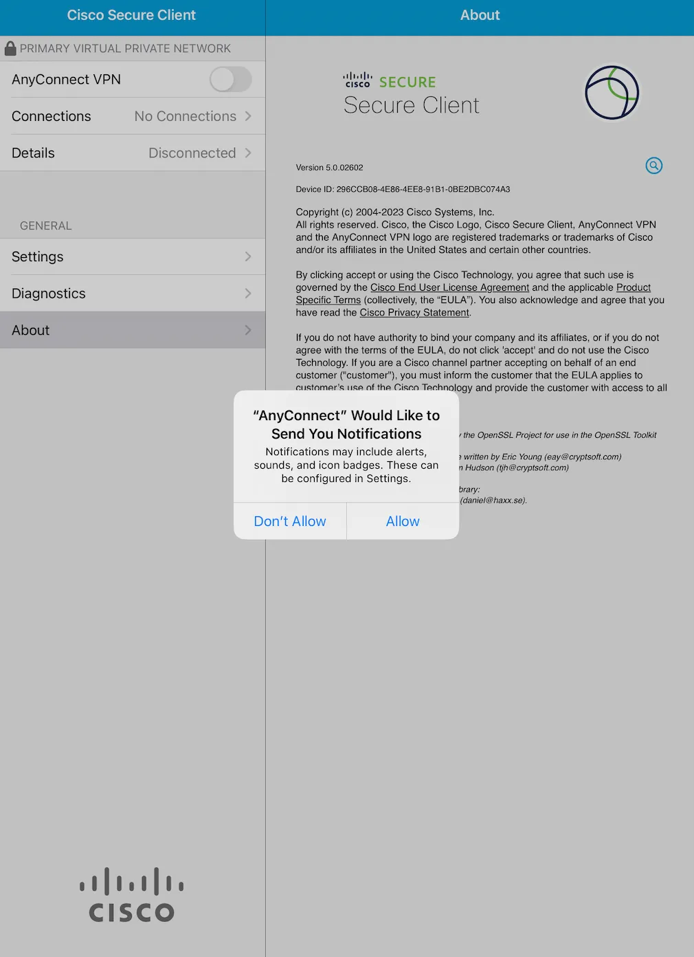 Step B: After installation, open the Secure Client app and check if the screen shown in the first image below is displayed. If the screen is displayed, then the installation is complete. When you open the application, you may be prompted to confirm the sending of notifications as shown in the second image below. You can choose either of the options.