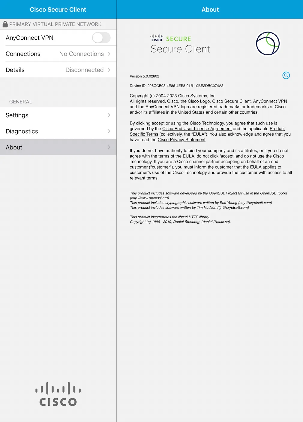 When you wish to disconnect the VPN, tap the toggle button on the upper left corner of this screen and confirm that “Details” has changed to “Disconnected”.