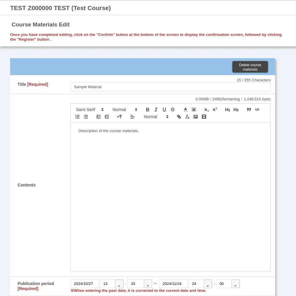This section explains the procedure for managing course materials (registering, updating, deleting).