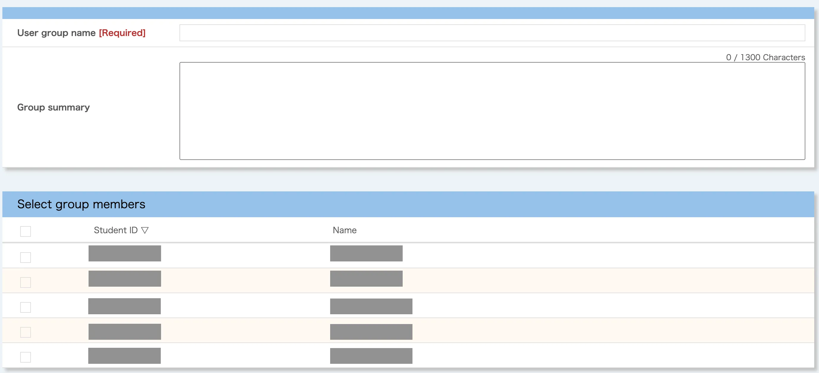 When you register a course group, a user group with members who are enrolled in each of the grouped courses are automatically registered with the name “(academic year)_(department code)_(timetable code)-group”. This is called the “default user group”. If the enrolled students are changed on UTAS after registration, the changes will be reflected in the list of members of each default user group through system integration.