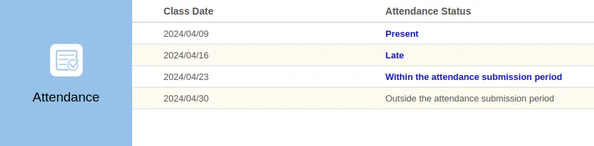 Status of past attendance is displayed in the “Attendance” column at the bottom of the Course Top screen in the form of “Present”, “Late”, “Absent” and so on.