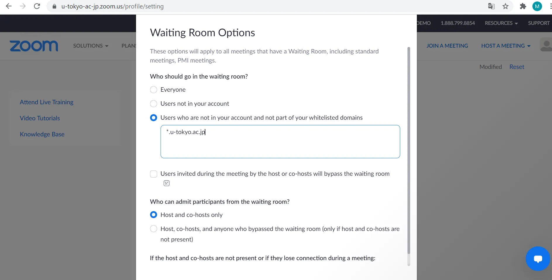 @utac.u-tokyo.ac.jp) will be automatically admitted to the meeting room without entering the Waiting Room. - ”Users who are not in your account and not part of your whitelisted domains”: Participants signing into Zoom with their UTokyo Account and participants signing in with email addresses of a specific domain will be automatically admitted to the meeting room without entering the Waiting Room. For online classes, it is recommended that you select this option and enter