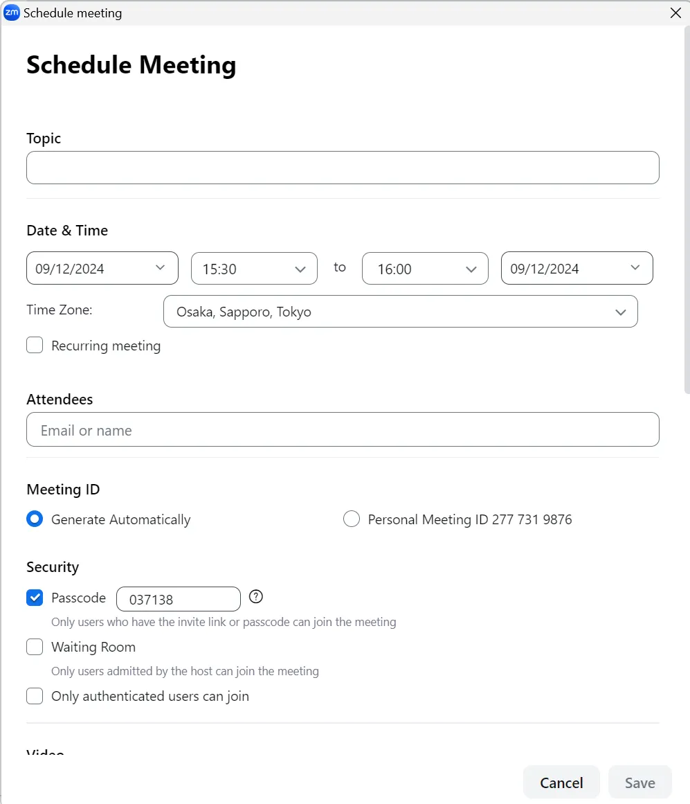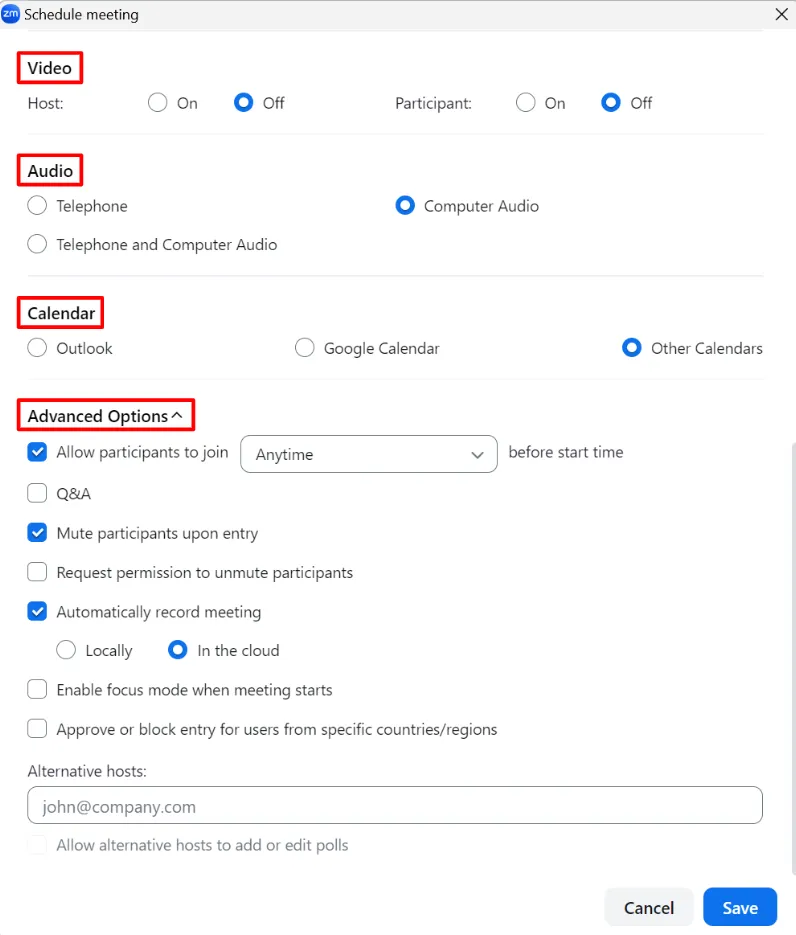 - Video : Whether to have video on or off at the beginning of the meeting can be set for both host and participants individually.