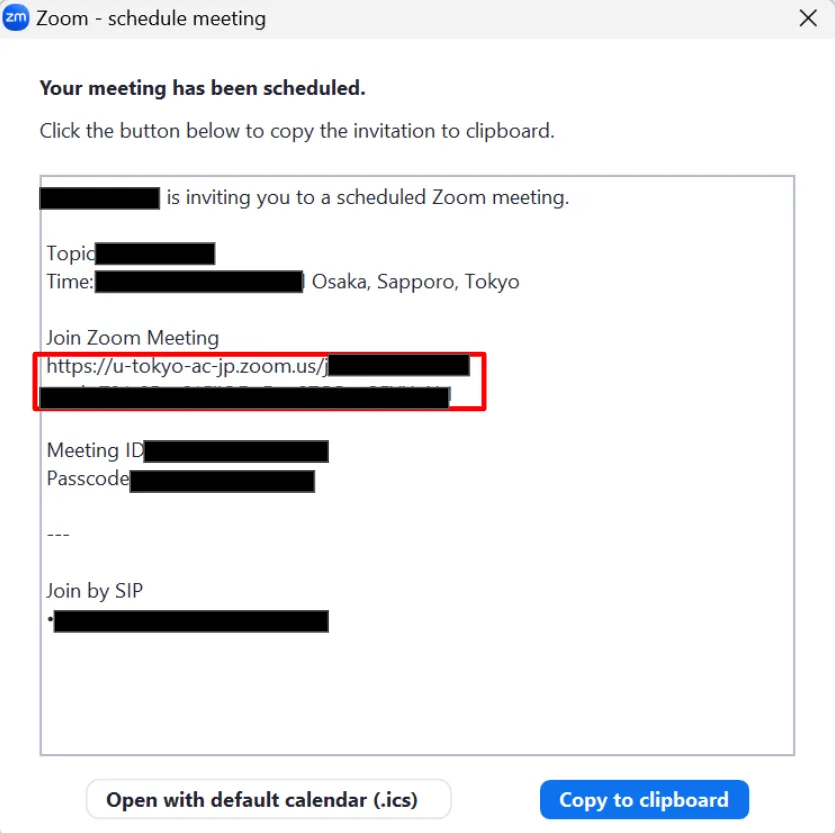 - Check the meeting information and copy the Zoom meeting URL listed under “Join Zoom Meeting”. Send email notifications to participants.