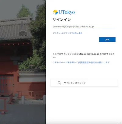 - Microsoftまたは東京大学のロゴの下に「サインイン」と表示されている場合
