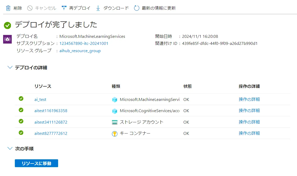 ポータルによる検証が成功したら,画面左下の作成ボタンをクリックし,しばらくしてデプロイが正常に完了しましたら,リソースに移動をクリックしてください.