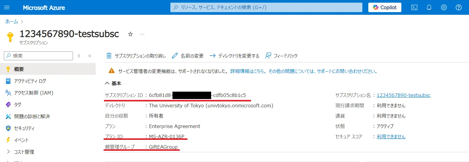 MS-AZR-0136P,親管理グループがGiftEAGroupであることをご確認ください.これ以外の表示の場合は無料分を利用することができず請求が発生してしまいますので.即時削除してください. - サブスクリプション名は変更が可能なので、利用するサービスによってはサブスクリプションIDを要求される場合があります.その場合ここに表示されるIDを指定してください.
