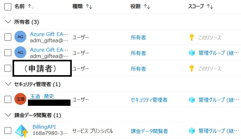 アクセス制御(IAM)を参照すると,ご自身のアカウント以外に以下の権限が設定されています.これらは本学と Microsoft との契約上必要な登録となり削除できませんので,あらかじめご承知おきください.(下図参照)- 所有者:Azure Gift EA operator(全体用とサブスクリプション用と2つ設定されます)