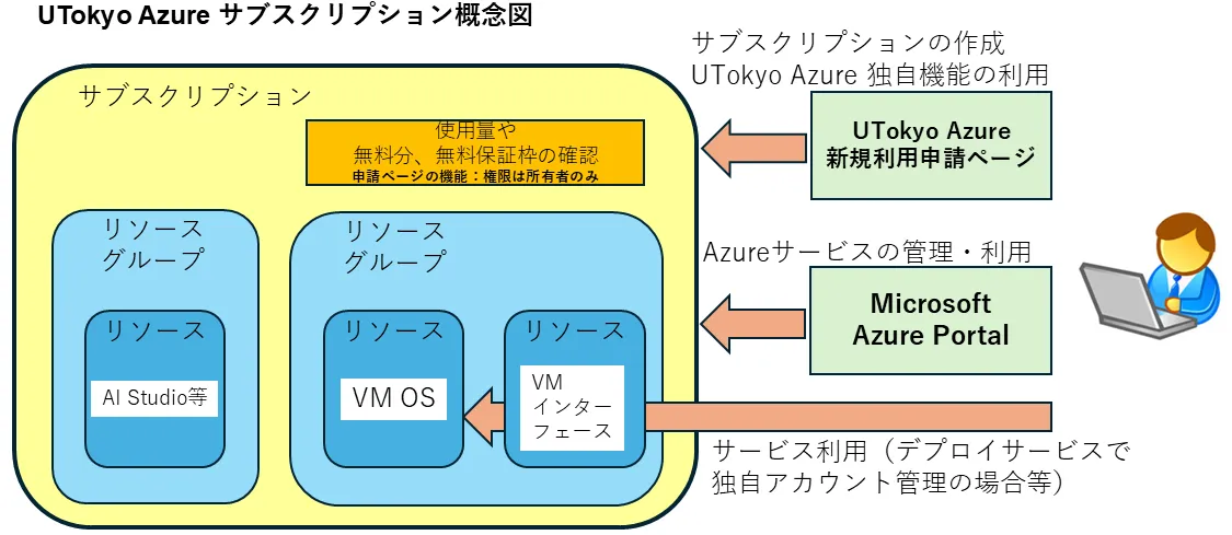 - UTokyo Azure においては、サブスクリプションはUTokyo Azure新規利用申請ページ(学内ネットワークからのアクセスに限定)から申請することで作成されます.