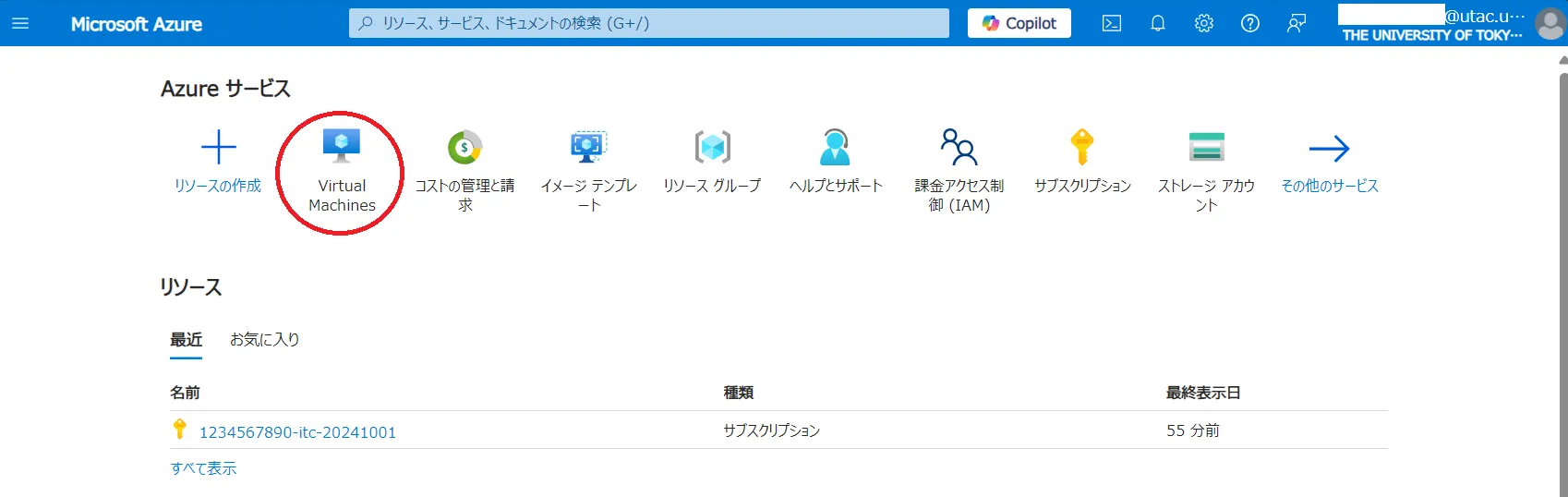 Azure portalにUTokyo Accountでログインし、リソースの欄にサブスクリプションがない場合(下図参照),先に以下のURLからサブスクリプションを申請してください.