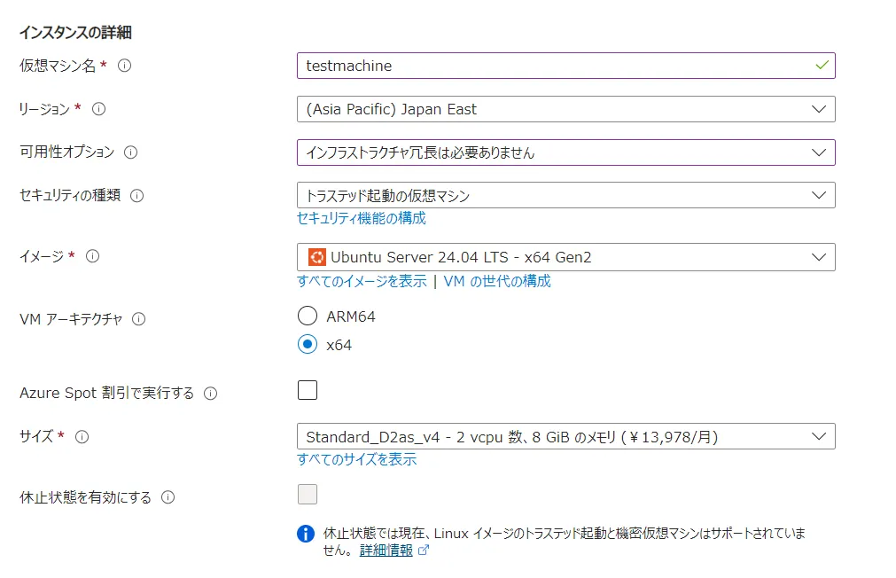 testmachineと入力しています. - リージョン:仮想マシンをどの地域(リージョン)にあるデータセンターにデプロイするかを指定します.使いたい機能が特定の国のリージョンにしかない場合は,その国のリージョンを選択ください.パブリッククラウド上での情報管理に不安がある場合は日本国内(