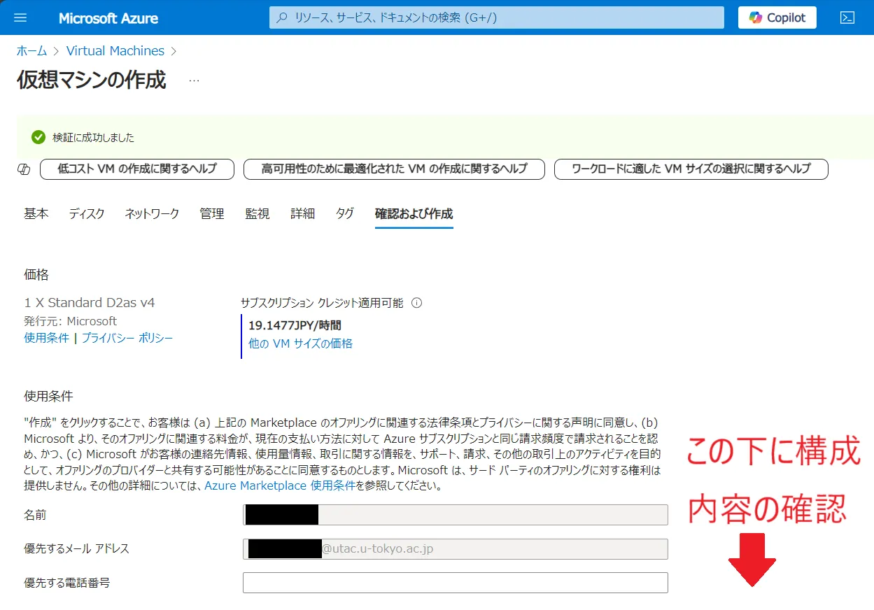 構成内容の検証結果,1時間ごとの予想費用,使用条件及びここまで設定してきた内容の詳細の確認の画面が表示されるので,問題が無ければ画面左下の確認及び作成ボタンをクリックしてください.