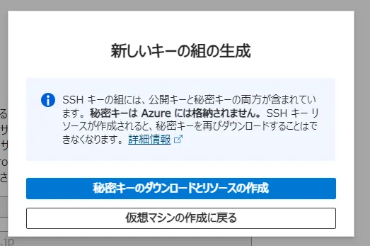優先する電話番号:本学の本件契約担当の番号が自動入力されています.そのままで問題ありません.- SSH鍵の新規作成を選択した場合,SSH鍵ペアの秘密鍵をダウンロードするかどうかの選択が表示されるので,ダウンロードしてください.リモートから初期アクセスする際にこの秘密鍵を使ってログインします.作成した仮想マシンにログインするリモート端末の適切な場所に,秘密鍵を事前に配置してください.