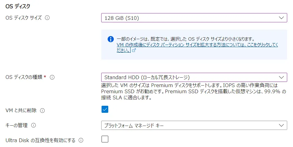 - OSディスクサイズ:いくつかのサイズから選択できますので,必要な容量を選択ください.