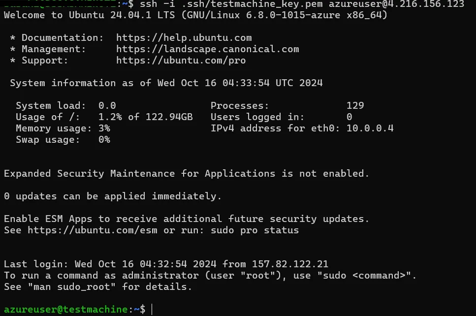 ssh -i [ダウンロードした秘密鍵] azureuser@[IPアドレス]