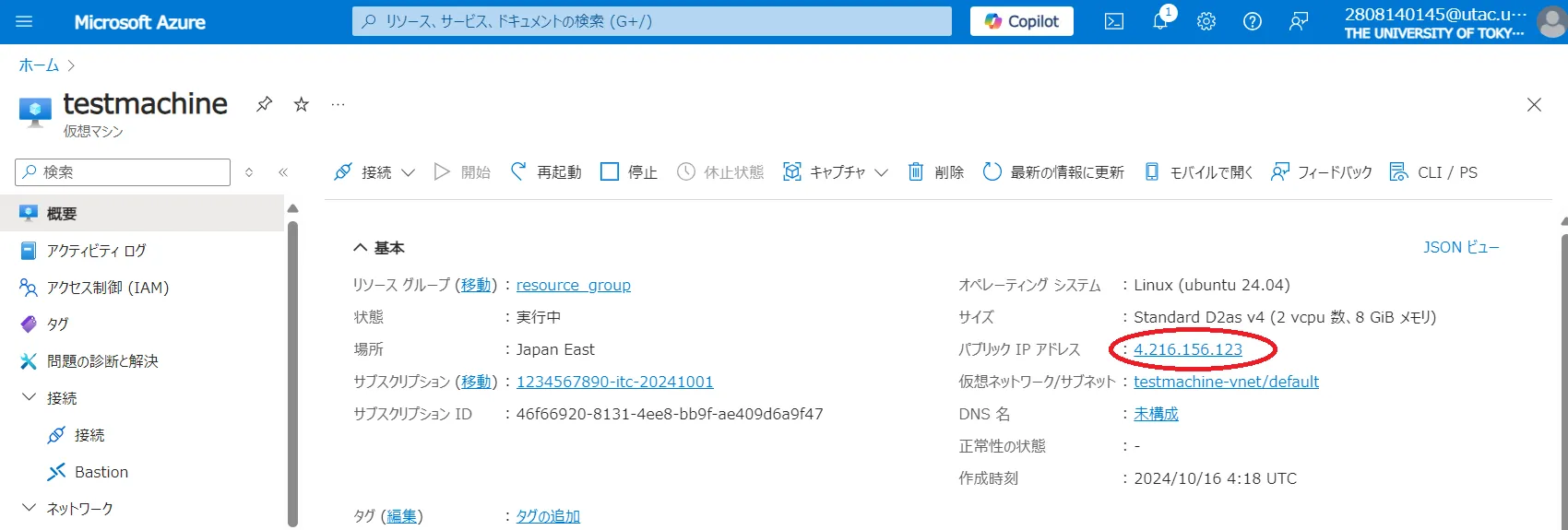 リソースに移動または仮想マシンリソース名のリンクをクリックすると,割り当てられたグローバルIPアドレスが画面右側に表示されていますので,そのIPアドレスに対してご自身の端末からSSHログインを行いログインできたら完了です.