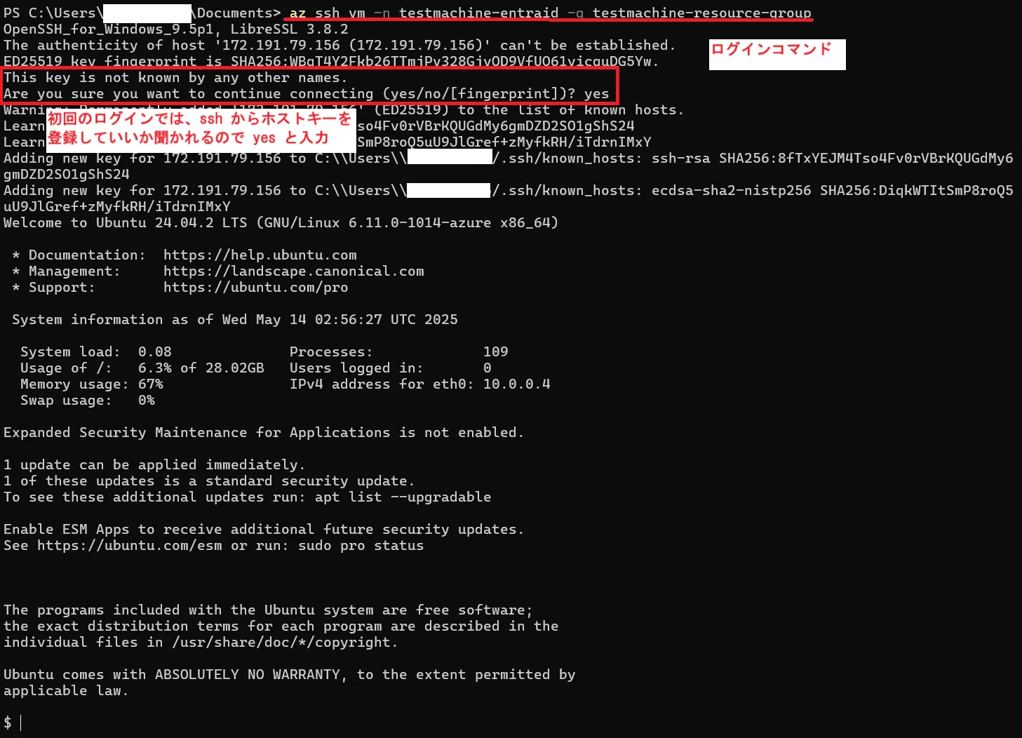 以後は Linux OS の場合の説明になります。Windows OS の場合は以下の Microsoft Learn の記事を参照ください。 Microsoft Learn:パスワードレスを含む Microsoft Entra ID を使用して Azure の Windows 仮想マシンにサインインする