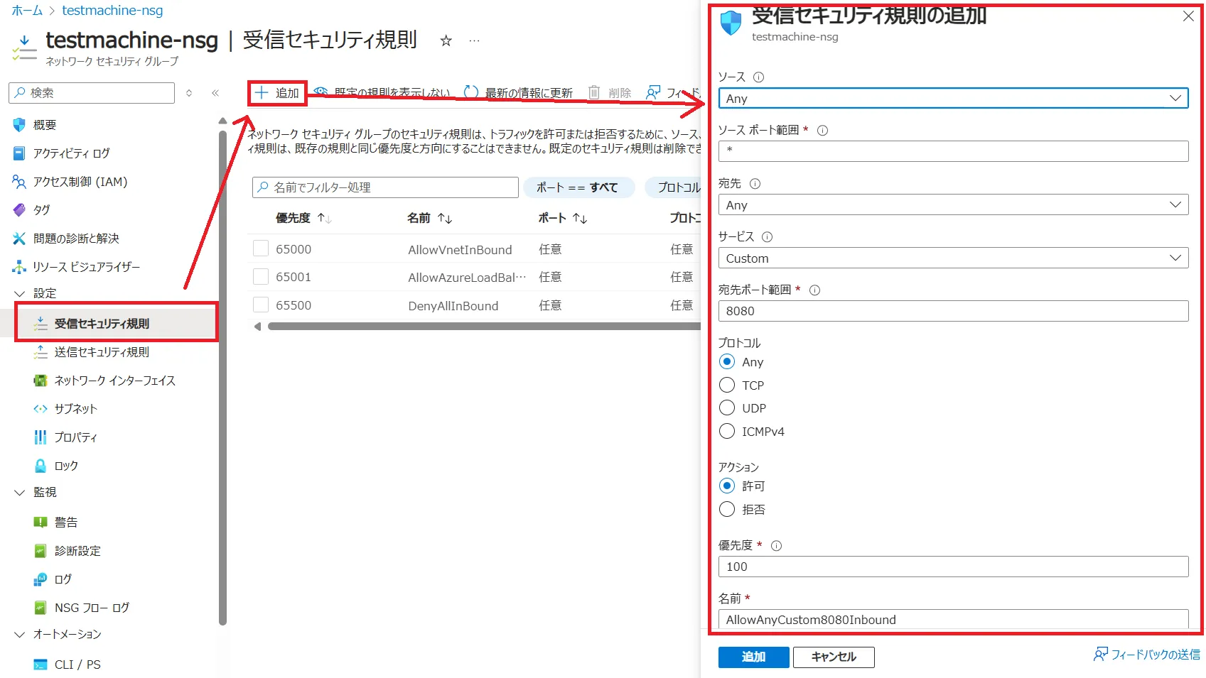 - ネットワークセキュリティグループリソースの左側に表示される一覧で,