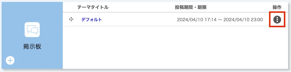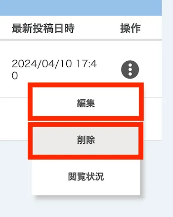 - 「掲示板」欄内で,スレッドを編集・削除したいテーマの右側にある