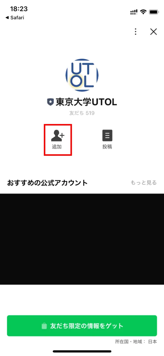 - 「公式アカウント」タブから探すか,検索窓に「東京大学 UTOL」と入力し,「東京大学 UTOL」を長押ししてください.