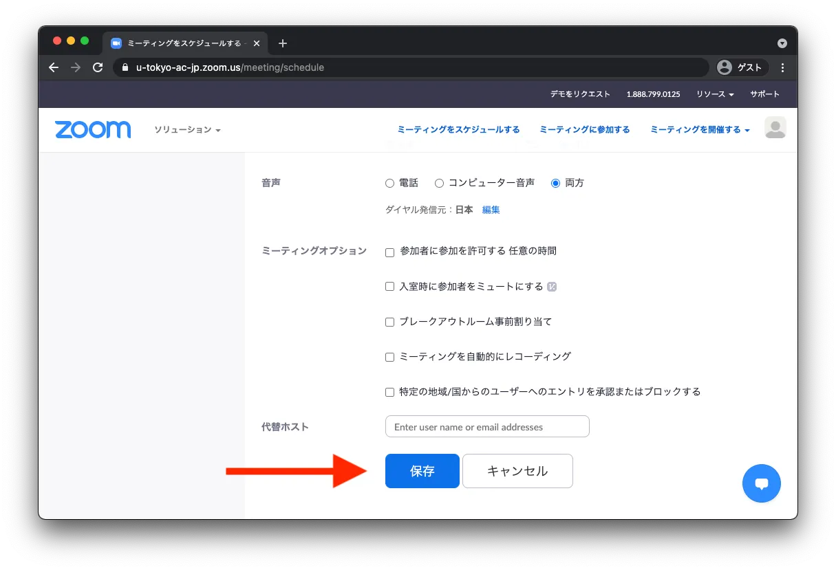 - 設定を変更して,下にある「保存」を押すことで,ミーティングをスケジュールします.この際,「ミーティングID」や「パスコード」を変更しない限り,会議室のURLは変わりません.