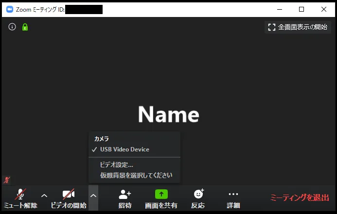 ビデオマーク : これを押すことによってビデオをオンやオフにできます(画面では現在カメラがオフ状態であるため「ビデオの開始」と表示されています).横にある上マークを押すとビデオに関する設定ができるようになります.