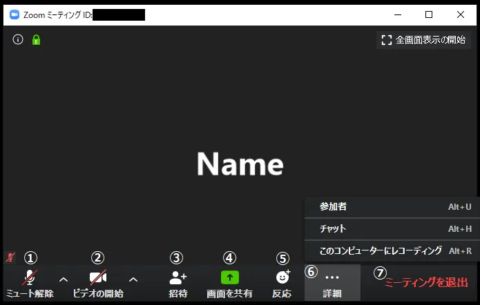 ミーティングを退出 : ミーティングを退出します.押した後確認画面が出るため,ボタンを押したらいきなり退出するわけではありません.