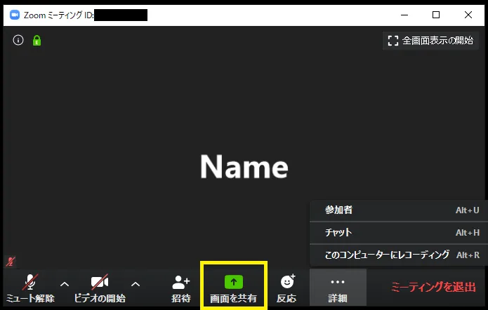 ミーティングを退出 : ミーティングを退出します.押した後確認画面が出るため,ボタンを押したらいきなり退出するわけではありません.