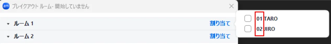 - まだ割り当てられていない参加者の一覧が横に出るので,そのルームに割り当てたい参加者にチェックをつけて選択してください.