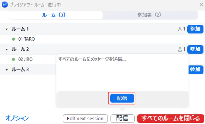 - 「メッセージを配信」する場合:送りたいメッセージを入力した後に,「配信」を押してください.送信されたメッセージは各ブレイクアウトルームで10秒間表示された後に消えます.
