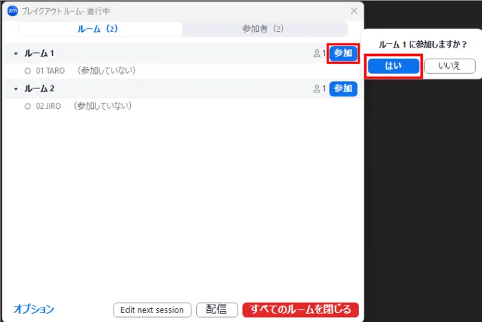 - 現在開かれているブレイクアウトルームの一覧が表示されるので,参加したいルームの横にある「参加」を選択し,「はい」を押してください.