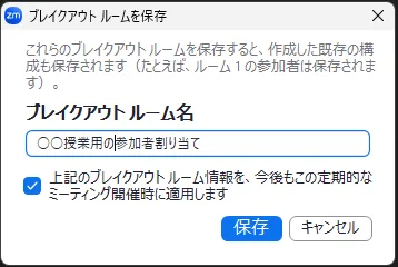 - 保存されている割り当ての中から,利用したいものを選択してください.割り当てを保存したときに,「上記のブレイクアウトルーム情報を、今後も定期的なミーティング開催時に適用します」をオンにしていると,自動的にその割り当てが選択された状態になります.