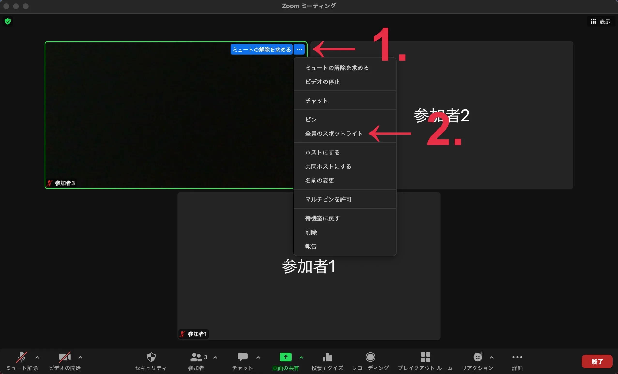 - 画面上部に「参加者が見ることができるのは,ホスト,共同ホスト,およびスポットライトされたユーザーだけです」という通知が表示されれば正しく設定できています.